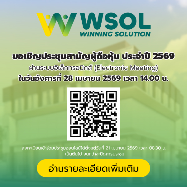 เราไม่เคยหยุดยั้งในการพัฒนาสินค้าและบริการภายใต้แบรนด์ให้ยั่งยืนและเติบโตเคียงข้างชาวไทยอยู่เสมอ และในปีนี้ เรามุ่งหวังจะยกระดับคุณภาพชีวิตของผู้บริโภคทุกกลุ่มวัยให้ตอบโจทย์การใช้ชีวิตให้มากยิ่งขึ้น WSOL PUBLIC COMPANY LIMITED จะเข้ามาตอบโจทย์ทุกความต้องการของไลฟ์สไตล์ผู้บริโภคในปัจจุบัน ภายใต้คอนเซปต์ “Winning solutions for you” จุดเด่นที่สำคัญ คือ เราจะเป็นทางออกที่ดีที่สุดให้กับเจ้าของธุรกิจและเหล่าผู้บริโภค โดยเน้นใช้เทคโนโลยีและนวัตกรรมใหม่ๆ ที่สอดคล้องกับพฤติกรรมของคนทุกคน ไม่ว่าจะเป็นกลุ่มคนทำงาน กลุ่มคนรุ่นใหม่ หรือแม้แต่นักท่องเที่ยวชาวต่างชาติ เรียกได้ว่า WSOL หรือ Winning Solutions พร้อมที่จะยกระดับคุณภาพและความหลากหลายของ ช่องทาง และ การเงิน เพื่อชาวไทยทุกกลุ่มเป้าหมาย